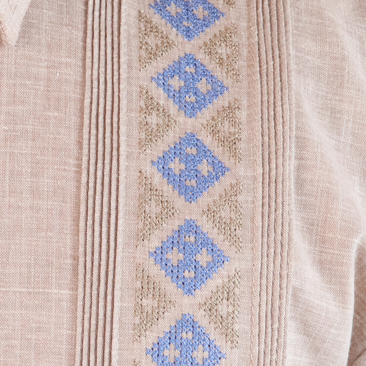 Camisa tipo guayabera moderna para hombre en color caqui, con bordado y alforzas. Combina estilo contemporáneo con detalles tradicionales para un look único.