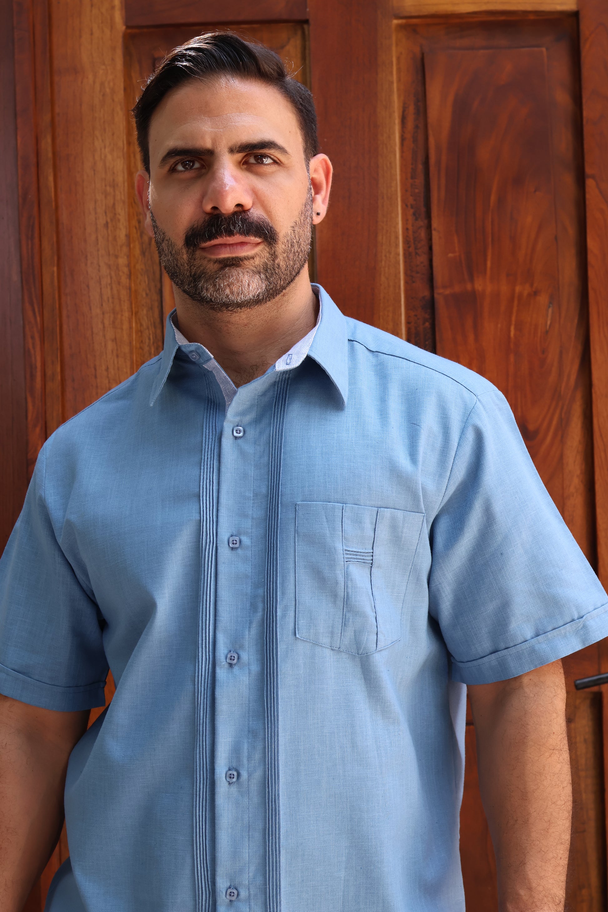 Guayabera de manga corta para caballero, confeccionada en algodón de alta calidad. Diseño Clasico que ofrece un ajuste moderno y elegante, ideal para cualquier ocasión informal.